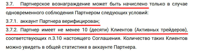 Условия гласят, что первый вывод средств становится доступным после того, как в списке привлеченных значатся 10 имен. До этого момента комиссия от зарегистрированных по партнерской ссылке учитывается, но остается недоступной для списания.