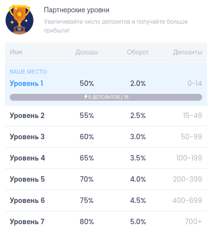 Ключевой показатель, напрямую влияющий на объем получаемого профита. Пересчитывается ежемесячно на основе общего объема проведенных по реферальной ссылке пополнений.