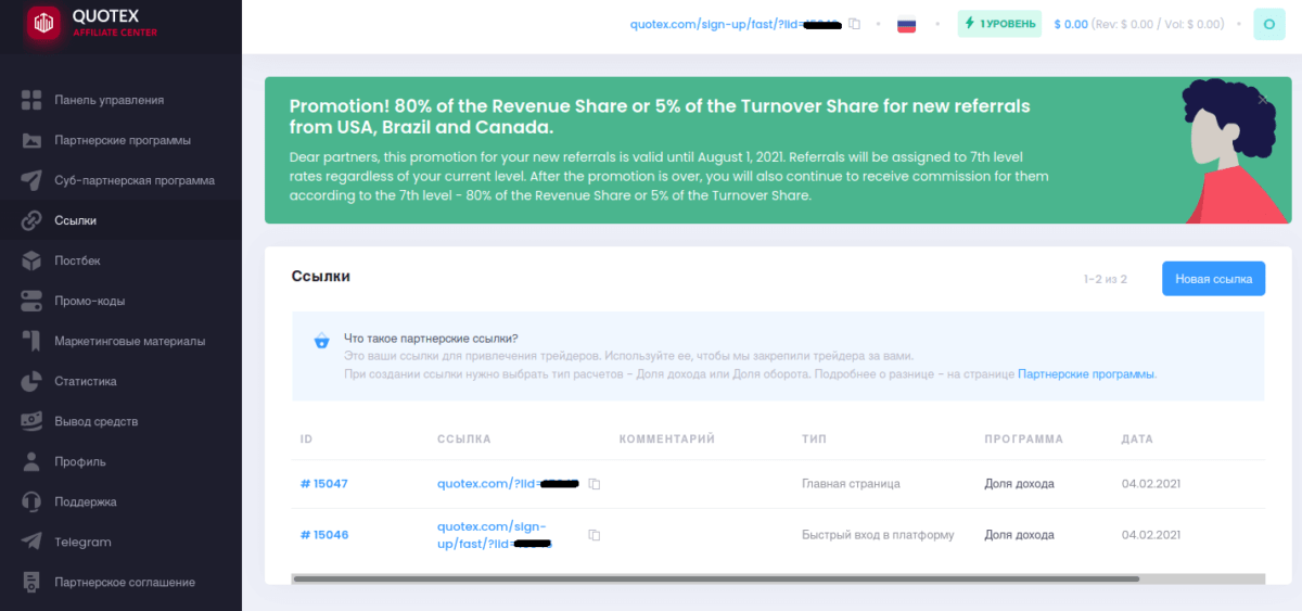 Quotex оказывает зарегистрированным членам маркетинговую поддержку. Получив соответствующую ссылку в отдельном разделе, можно распространять ее среди потенциальных биржевых игроков. При этом на открывающейся странице заинтересованным лицам будет представлена объемлющая информация обо всех преимуществах заработка при открытии счета в Квотекс, предоставлен список наиболее перспективных активов и мнение тех, кто уже успел воспользоваться возможностью заработка на бинарных опционах.