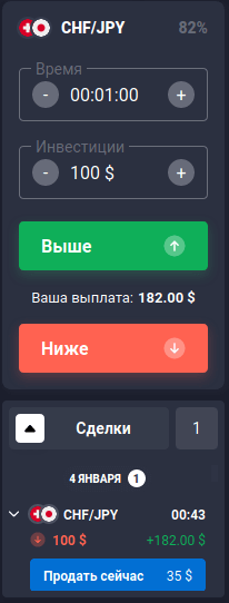 В подтверждение тому, что позиция была открыта, в панели истории появляются данные о ней. Плюс бинарных опционов — прибыль по ним известна заранее и отображается в момент открытия. Для рассматриваемой позиции она составила 82%, то есть на каждые 100$ вложенных денег можно получить 182$ прибыли. В случае, если закрытие в противоположном направлении, вложенная сумма полностью списывается со счета.
