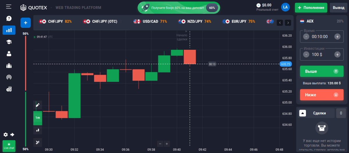 Умение обращаться с торговым терминалом — основополагающий фактор трейдерского успеха. В этом материале рассмотрим опции, предлагаемые терминалом, возможности для графического и технического анализа тренда и как работать со всем этим. Брокер Квотекс предлагает множество инструментов для заработка на бинарных опционах и оперативный вход в рынок — залог успеха в вопросах получения профита. Терминал предлагает множество инструментов для принятия решений и управления открытыми лотами. Как правильно обращаться со всеми предлагаемыми опциями, рассмотрим далее в этом обзоре.
