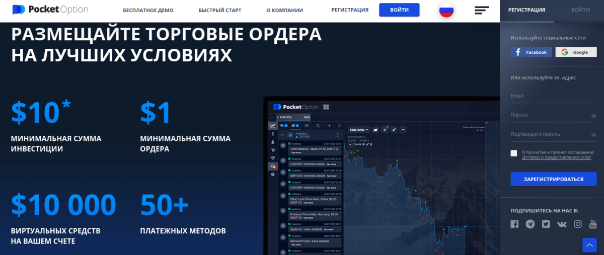 Pocket Option, в отличие от нечистых на руку конкурентов, предлагает одни из самых лояльных условий для трейдеров любого уровня. Минимальная сумма депозита — всего $10. Открыть ордер в личном кабинете можно имея на балансе $1. Для вывода и пополнения предлагается более 50 методов платежа. С такими условиями возможность для заработка открывается даже неопытным биржевым игрокам. Плюс ко всему для таких клиентов предлагается возможность создания демонстрационного депозита с начальной суммой в $10 000 (как работать с таким счетом рассказывает отдельная статья). Это поможет в самые кратчайшие сроки освоить навыки торговли и получить бесценный опыт принятия решений об открытии сделок, не рискуя личными финансами.