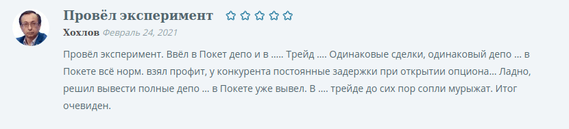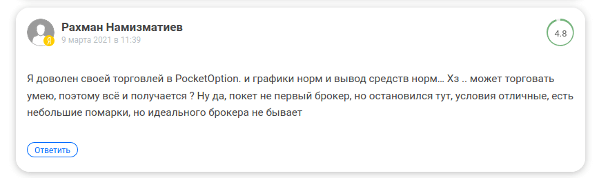 Другой трейдер, обладающий внушительным опытом работы на биржевых площадках, ставит оценку в 4,8 баллов из 5. Отмечает отсутствие недостоверных данных при отображении рыночных графиков и задержек при списании денег. Как верно утверждает клиент, идеальной компании не существует, но Покет Опшен — фирма, находящаяся всего в нескольких шагах от совершенства.