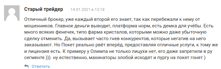 Следующий трейдер указывает на тот факт, что именно к Покет Оптион перешли многие клиенты, успевшие обжечься, торгуя у всем известных мошенников, которых уже и след давно простыл. Отдельным преимуществом указывается на наличие отличной бонусной программы. С помощью внутренней валюты — кристаллов, трейдеры могут получать дополнительные преимущества при торговле. Например, отменять убыточные сделки определенного объема, получать кешбэк от оборота и бонусы на пополнение счета. Автор отзыва также заметил, что большинство негативной информации в открытом доступе — происки конкурентов, не сумевших придумать ничего лучше, чем распространять откровенную ложь.