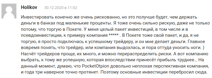 Следующий трейдер выбрал для себя стратегию пассивного инвестирования путем копирования сделок других биржевых игроков. Торговая платформа позволяет в любой момент времени выбирать источник для копирования позиций. Внимательно изучив подноготную Pocket Option, автор приходит к выводу, что компания развивается успешно и на ближайшие три года сотрудничество с ней предвещает потенциальный профит. Этот вывод сделан из опыта сотрудничества с другими брокерами, канувшими в лету.