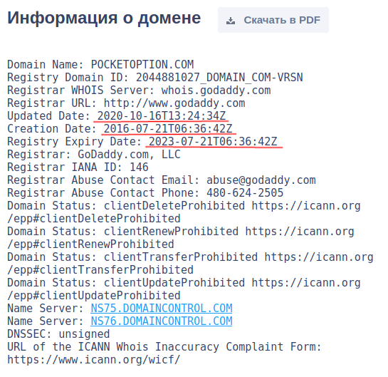 Дата создания сайта — 2016 год, с тех пор было произведено обновление в октябре 2010 года и в текущем 2021 официальный ресурс продолжает динамично развиваться. Портал зарегистрирован до 2023 года. С таким сроком существования можно смело утверждать об отсутствии признаков «однодневки». Покет Опшен уже имеет пятилетнюю историю работы и на достигнутом останавливаться не планирует.