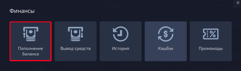 Во всплывающем меню выбираем пункт «Пополнение баланса». Этот же способ применяется и для вывода средств, получения истории совершенных финансовых операций и текущего уровня кэшбэка (варьируется, в зависимости от статуса трейдера).