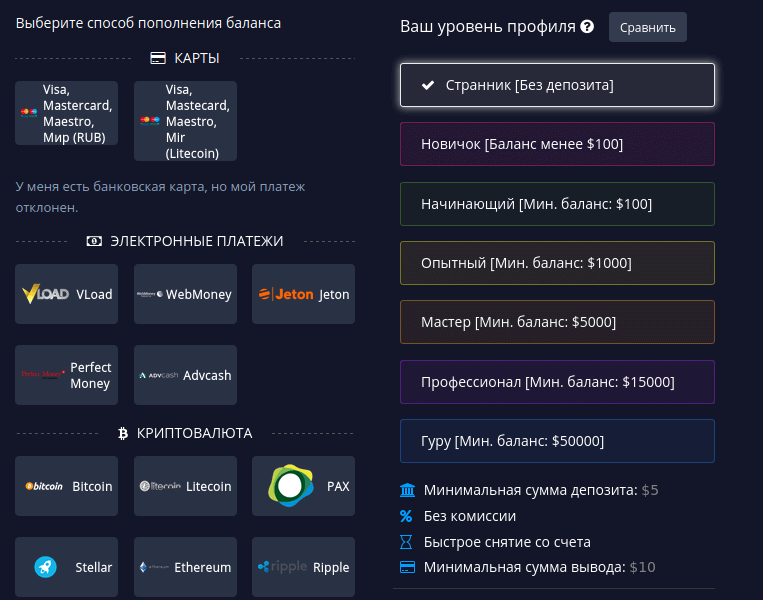 Капитализацию криптовалютой можно проводить уже начиная с порога в $5. Максимальный уровень не установлен — баланс можно увеличить на любой желаемый объем. В остальном все этапы проведения платежа схожи: