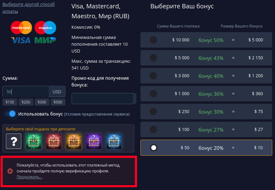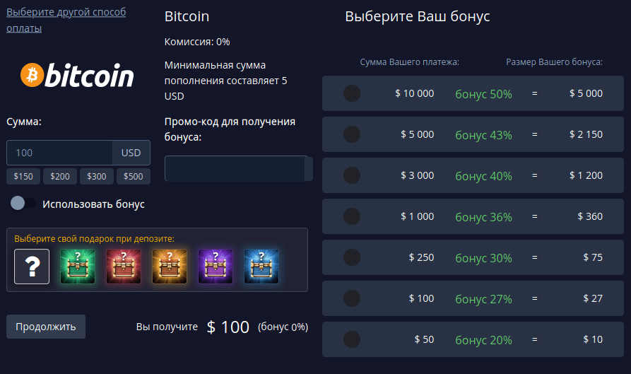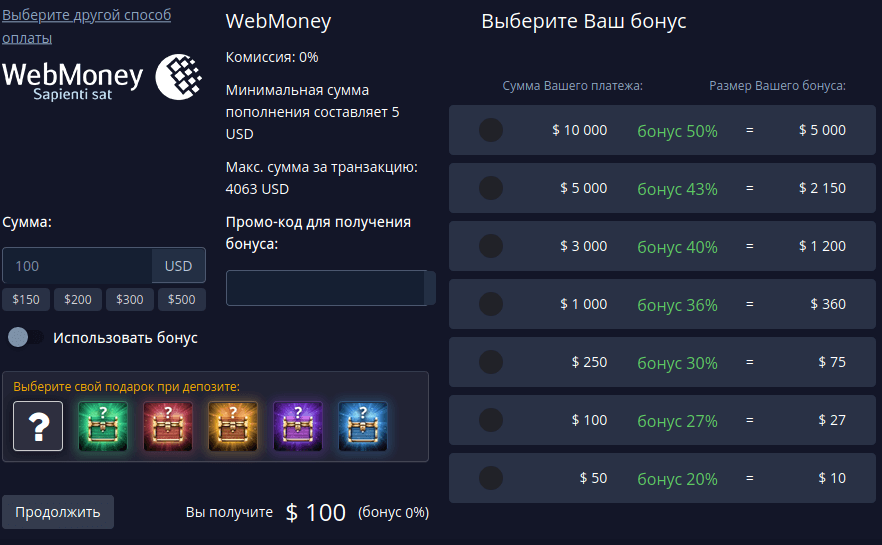 После перехода в этот раздел потребуется выбрать нужную сумму, ввести промокод (при его наличии) и получить приятный бонус (от данной опции можно отказаться) — от 20% до 50%, в зависимости от суммы, на которую происходит увеличение.