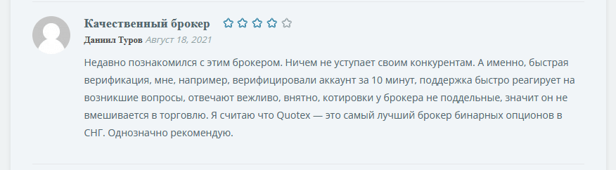 К озвученным выше преимуществам следующий автор упоминает в публикуемый отзыв о Quotex Market информацию про компетентную техническую поддержку. Получить оперативный ответ на свой вопрос во многих случаях может стоить трейдеру дополнительной прибыли, и критически важно, чтобы сотрудники брокера всегда имели возможность быстрого ответа на возникающие вопросы. Здесь этот вопрос проработан на самом высоком уровне. Еще один неоспоримый «плюс» рассматриваемого брокера БО перед конкурентами – низкие сроки обработки финансовых транзакций. И если с пополнением средств у всех финансовых компаний дела обстоят одинаково, то отзывы о выводе средств во многих местах не внушают доверия. Но когда речь заходит о Квотекс, очень редко можно встретить информацию о том, что перевод был задержан.