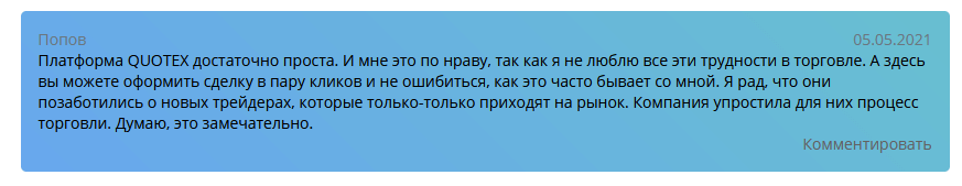 В первом отзыве о Квотекс 2026 года о компании на одном из известных финансовых форумов речь идет об удобной системе проведения торгов. И это общеизвестный факт – хотя предлагаемая программа для заключения сделок является собственной разработкой, в терминале имеются все необходимые инструменты для прибыльной торговли – индикаторы технического анализа, несколько видов баров, доступных к использованию, графические модели. Одним из немаловажных достоинств называется возможность открытия демо-счета без долгой регистрации. Для старта на учебном аккаунте достаточно одного клика на главной странице официального сайта.