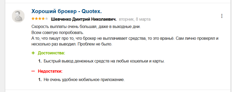 Еще один важный нюанс, который стоит отметить – качество предоставляемых котировок. Часто именно в этом кроется главная особенность нечестных на руку компаний. Появляющиеся на графике котировки, которых на реальном рынке не было, направлены на поглощение клиентских защитных ордеров. Как утверждается в фидбэке выше, в Quotex Broker подобных проблем не наблюдается.