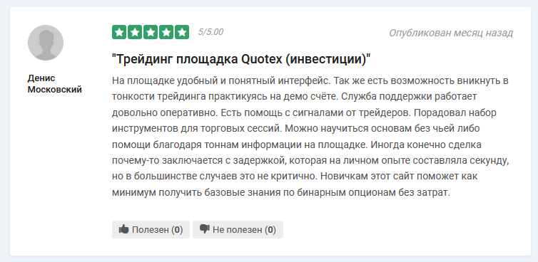 Часто анализ существующих отзывов клиентов проводят начинающие биржевые игроки, находящиеся в активном поиске. Для них важно получить максимально понятный набор услуг и технических средств. И следом идет фидбек от трейдера такого плана. Он утверждает о простоте взаимодействия с платформой брокера. С этим не поспорить – для заключения сделки достаточно ввести желаемый объем открываемой позиции и выбрать направление, в котором цена окажется через установленный период экспирации опциона. Если прогноз верен – на счет зачисляются вложенные средства плюс текущая доходность по используемому актив, в противном случае сделка считается убыточной. Нет никаких сложных правил расчета доходности, как в других производных активах, либо иных обязательств, накладываемых на клиентов в ходе исполнения опциона. Внутри платформы можно найти раздел помощи, в котором даны ответы на все часто возникающие вопросы. На многих платформах можно найти функциональные промокоды, дающие определенные преимущества через Квотекс Маркет, что на первых порах может оказать большую помощь начинающим.