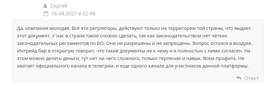 Отзыв первого автора поверхностно оценивает надежность с юридической точки зрения. Российское законодательство никак не регулирует сферу отношений при деятельности с опционами, но и запрета на проведение подобных операций нет. Поэтому если есть возможность заработка, ее необходимо использовать. И с этим утверждением нельзя не согласиться.