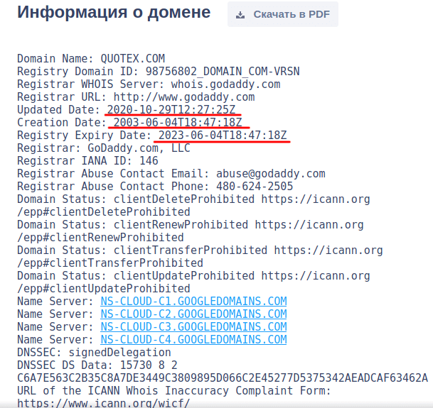 Датой создания домена указан 2003 год. В 2020 произошло обновление ресурса, а регистрация заканчивается в 2023 году. Многие однодневки, не задумываясь о своем будущем, часто регистрируют доменные адреса сроком не более года. Далее происходит смена имени, названия, дизайна. Всего, чтобы обманув одних, другим казаться совершенно новым участником рынка. Фирма изначально создавалась крепким бинарным брокером, способным не только предоставить доступ к оперированию самыми перспективными активами, но и обеспечить высочайший уровень прозрачности и безопасности трейдинга. Поэтому и регистрация домена на момент написания статьи будет подходить к концу через два года, и нет никаких сомнений, что она будет продлена.