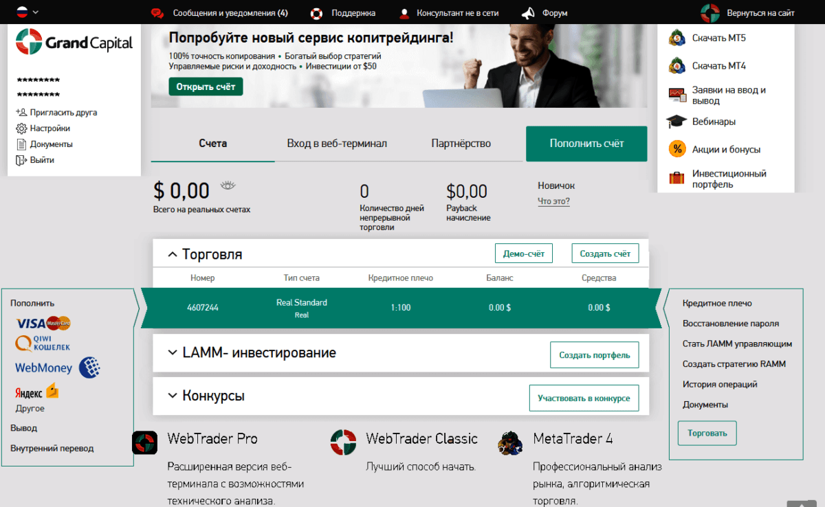 Все необходимые трейдеру опции визуально видны на первой странице Кабинета; например, все ваши активные счета, а в правой части экрана – все необходимые опции: