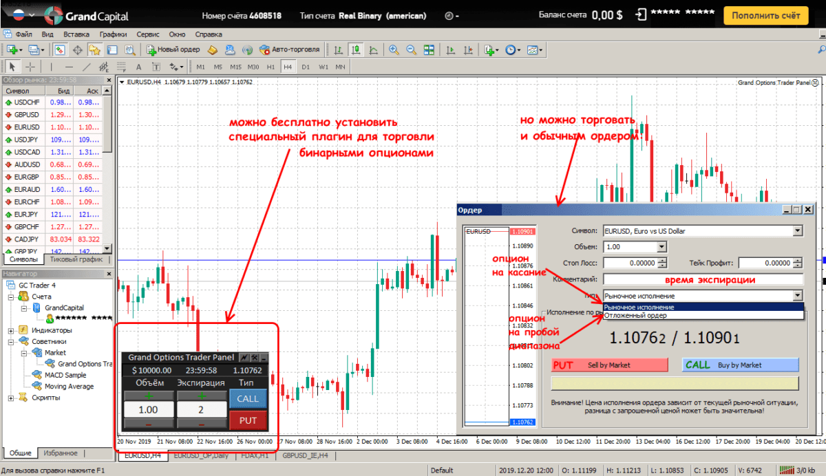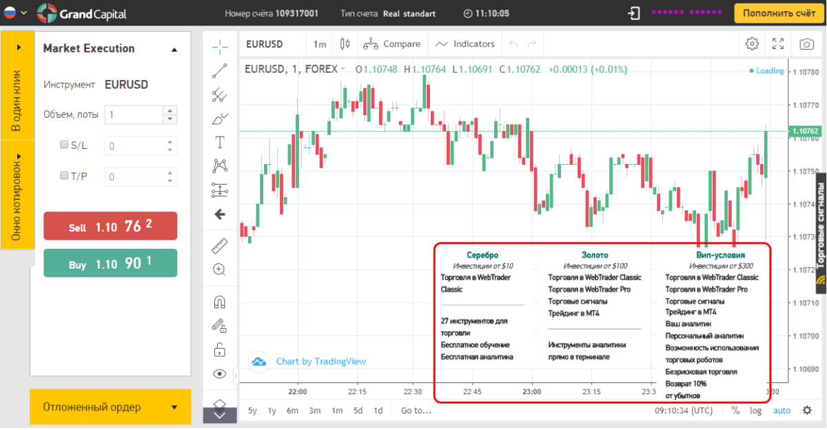 Специального программного терминала для бинарных опционов GrandCapital нет, можно работать через обычный Web-терминал:
