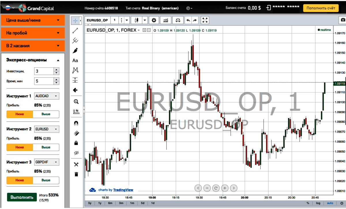 Для работы с бинарами придется открывать отдельный счет, вы получите отдельный логин/пароль, но повторная регистрация Гранд Капитал уже не требуется. Компания отказалась от отдельных активов на европейские и американские опционы, и оставила только американский вариант − с высоким процентом премии (от 80% и выше) и возможностью досрочного закрытия.