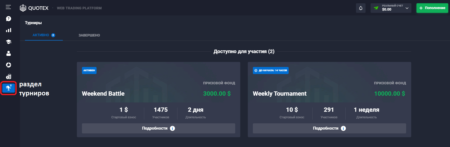 В списке предлагаемых состязаний представлены как турниры Квотекс без вложений, так и соревнования с обязательным взносом. Таким образом, брокер бинарных опционов открывает путь к получению дохода любому желающему. О том, где найти необходимую информацию и как выиграть в них, поговорим далее.
