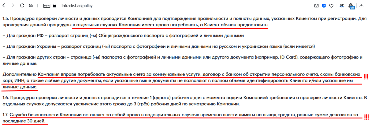 Тем, кто все еще сомневается и пытается апеллировать к рекламным заявлениям брокера («анонимность торговли», «верификация Интрейд Бар не нужна» и прочее), предлагаем внимательно почитать раздел AML и KYC на официальном сайте. Там четко сказано: