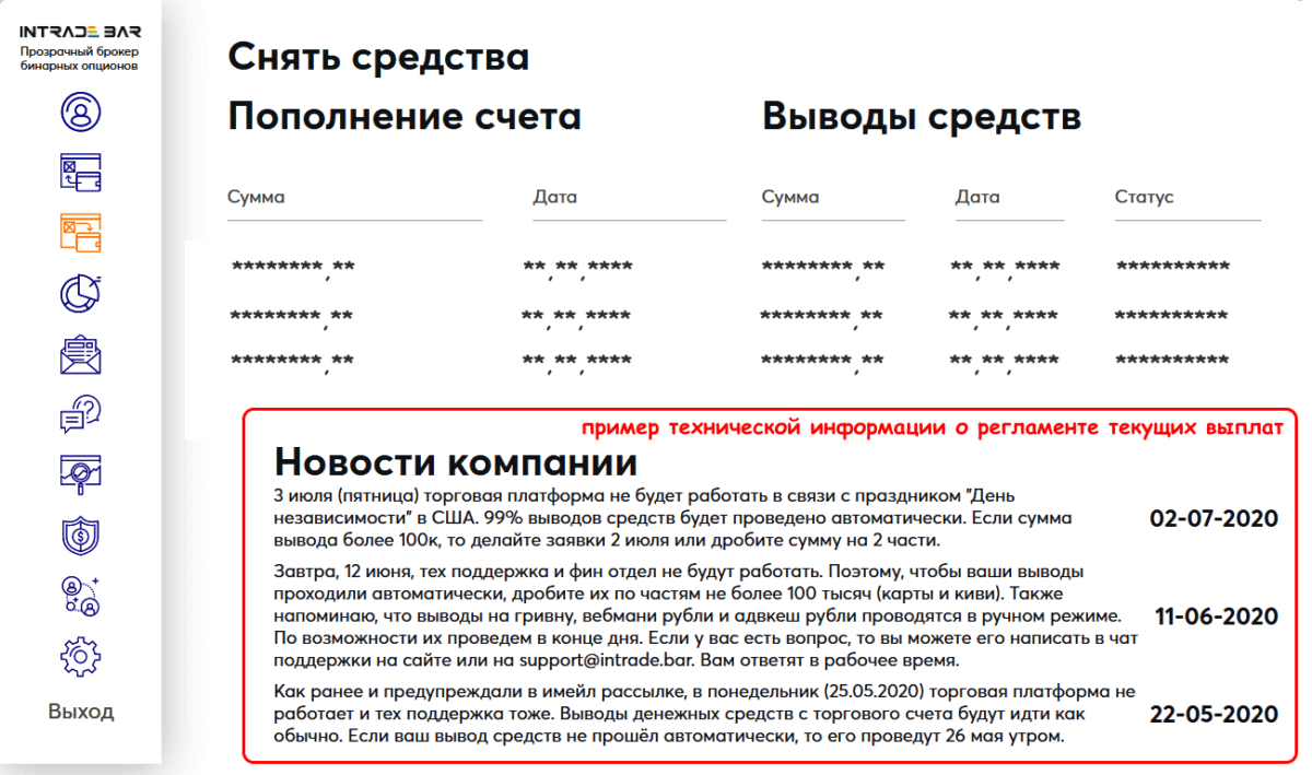 С 2020 года Intrade Bar предлагает клиентам автоматический вывод средств денег: достаточно войти в Личный Кабинет и прописать удобные для вас платежные реквизиты, тогда при оформлении заявки на вывод достаточно будет только указать сумму. Но в некоторых «особых» случаях, как, например, заявки на сумму более 100000 рублей (или в USD в эквиваленте) сотрудники компании выполняют вручную после дополнительного подтверждения. Как вы понимаете, любые сомнения трактуются против клиента и автоматической обработки заявки, так что лучше выводить средства в период работы службы поддержки.