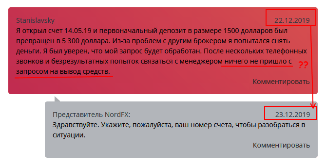 Менеджеры NordFX быстро реагируют на любой отрицательный отзыв, причем не только на своем форуме, но и на внешних ресурсах. Особое внимание уделяется тем отзывам, где есть реальная фактура (номера счетов, скрины отчетов, документов, диалогов), в таких случаях брокером обязательно выкладывается детальная переписка. Правильный и эффективный подход.