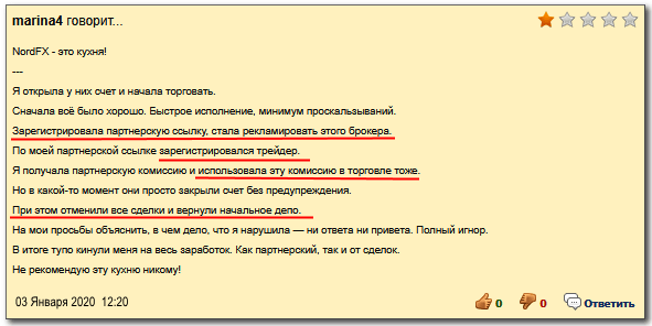 Панические отзывы этой дамы появились одновременно на нескольких форумах, реакция компании была оперативная, но после требования указать исходные данные переписка ушла в частное общение. Ситуация знакома автору по личному опыту. Клиент невнимательно читает договор или партнерское соглашение, условия получения бонуса или участия в акциях. Массовое нарушение – привлечение по партнерской ссылке связанных лиц (родственников, друзей, соседей и пр.), которые иногда даже понятия не имеют, что они торгуют на Форекс.