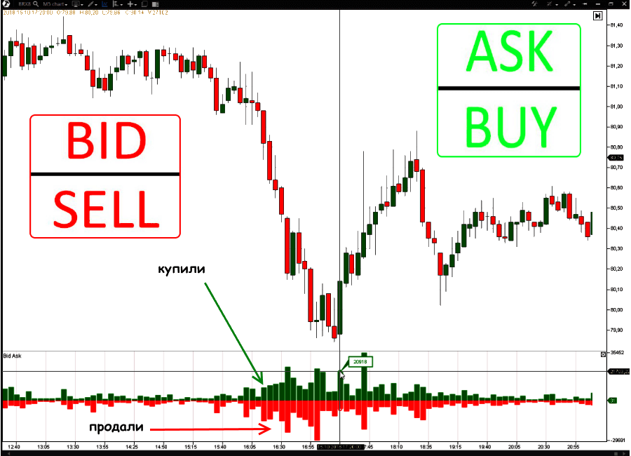 В биржевых платформах типа ATAS, MarketDelta, Thinkorswim есть специальные индикаторы, которые выводят на экран как цветную гистограмму объем заявок (в единицу времени), закрытых по Бид и отдельно – зафиксированных по цене Ask. На Форексе в терминалах нет информации о конкретных объемах, так что оценить можно (примерно) только количество таких сделок. Но общая логика на всех рынках одинакова. Если преобладает зеленый цвет, то рынок больше покупал на уровне Ask, а продаж по Бид было значительно меньше. Результатом этого дисбаланса стало активное движение вверх. Накопление покупок означает действие (присутствие) на рынке крупных покупателей, скопление интереса на продажу – продавцов. Кстати, информацию о расстановке торгового интереса вы можете увидеть в стакане цен (биржевом).