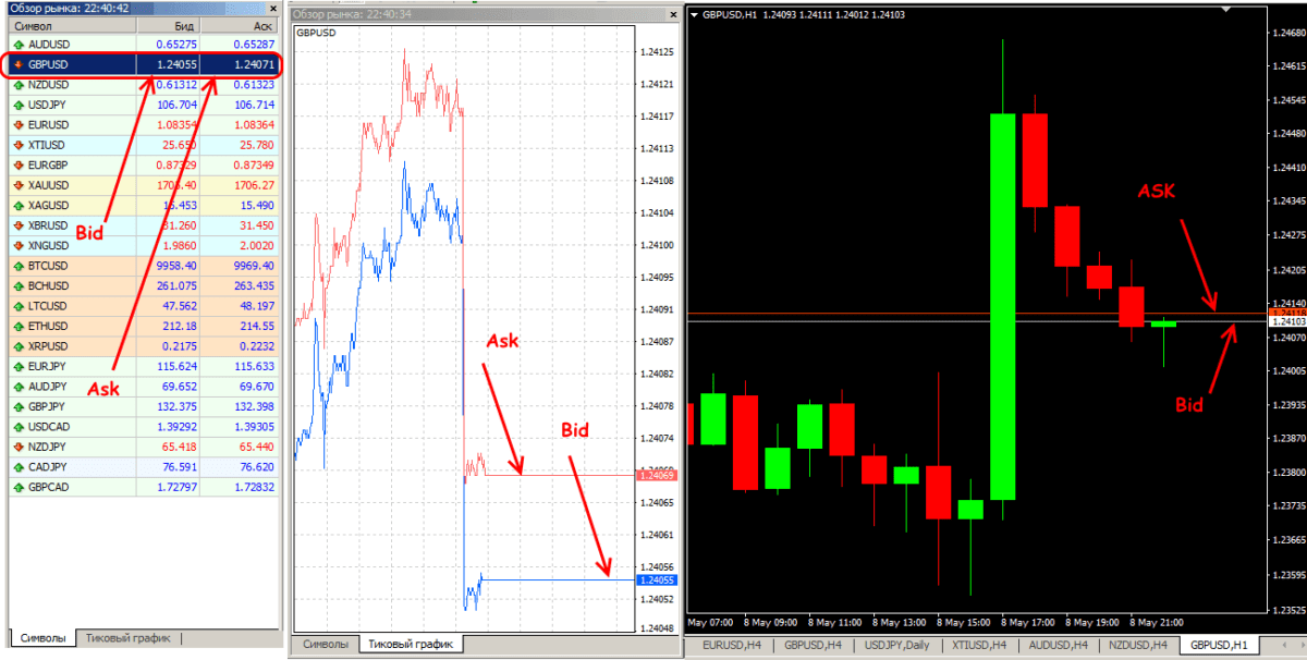 «Бид» − max-ная цена покупателя, которую он может заплатить за товар (финансовый актив), с точки зрения экономической теории это будет уровень рыночного спроса. Напомним – все стараются «купить подешевле», но ваши ордера Sell (заявки на продажу) брокер будет пытаться исполнить именно по текущему Bid.