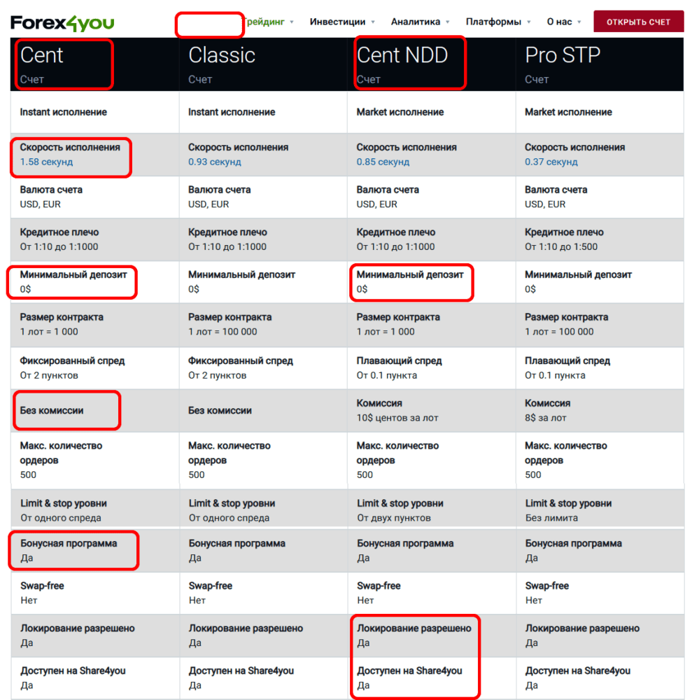 Для выбора торговых и технических условий обычно используют сравнение всех типов счетов, которые предлагает брокер. Например: