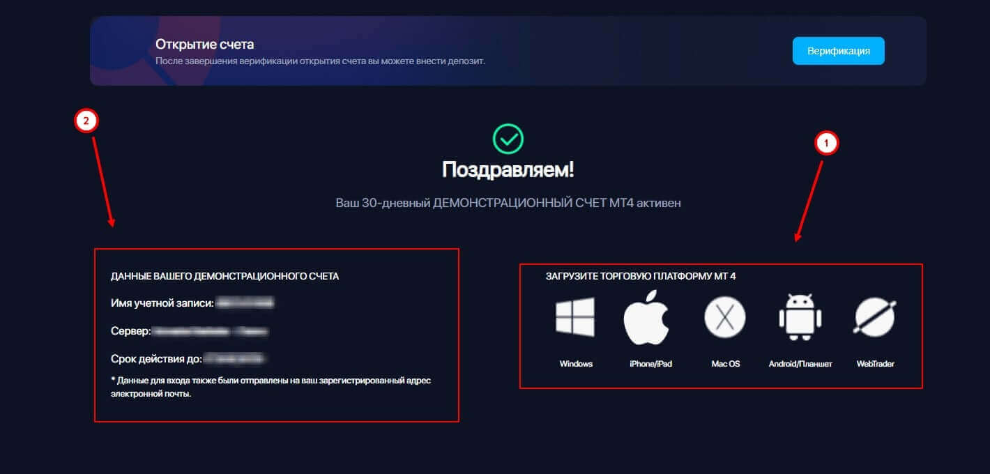 После создания демонстративного счета останется лишь загрузить платформу и авторизоваться. Сервис предоставляется прямые ссылки на скачивание MT4 или MT5 для Windows, iPhone/iPad, MacOS, на андроид (Android) или WebTrader. Данные для демо аккаунта, которые нужно будет указать на торговой платформе указаны в левой части страницы клиента.