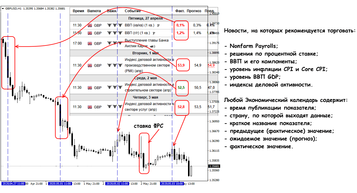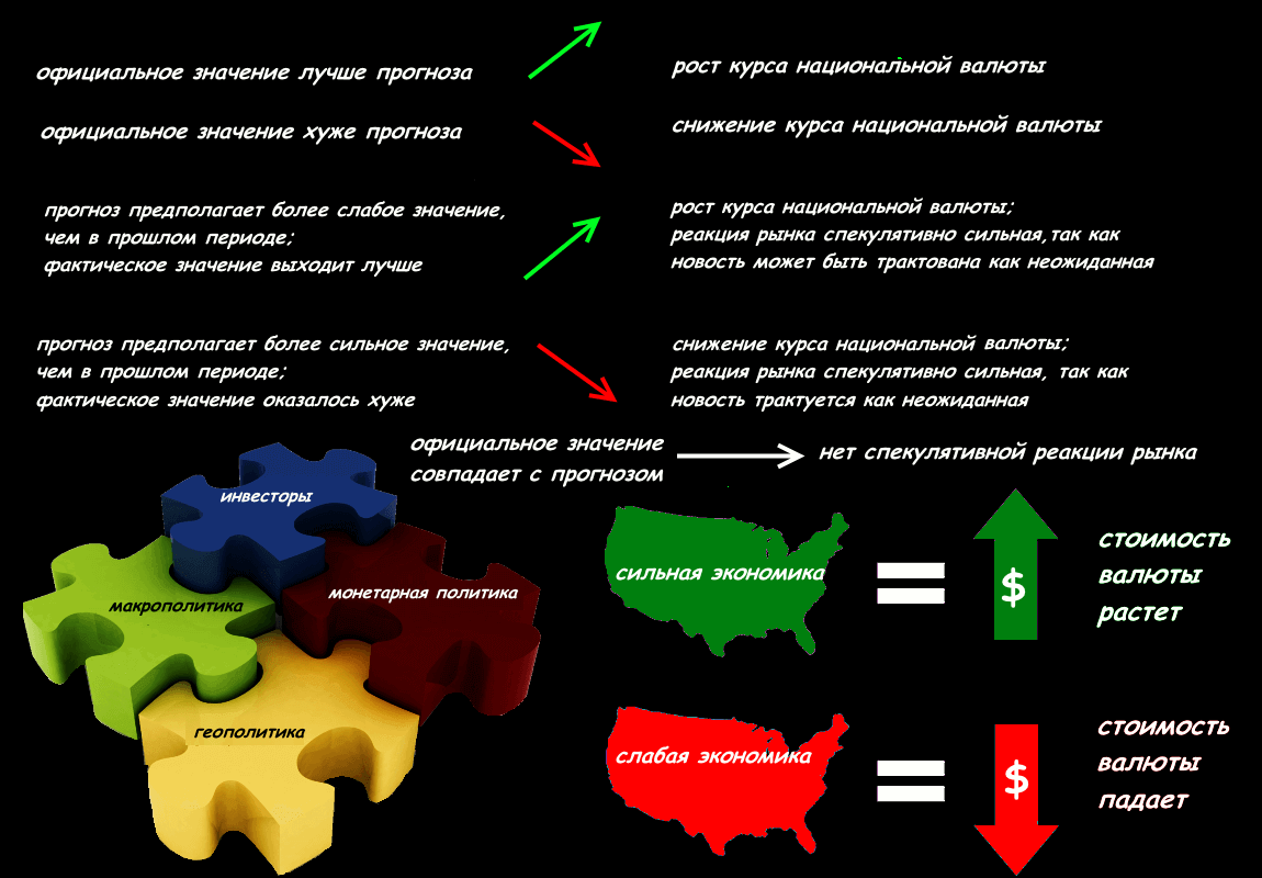 - факт полностью противоположен прогнозу – после некоторой паузы (рынок должен оценить ситуацию!) возможен резкий разворот текущего тренда или иные неприятности