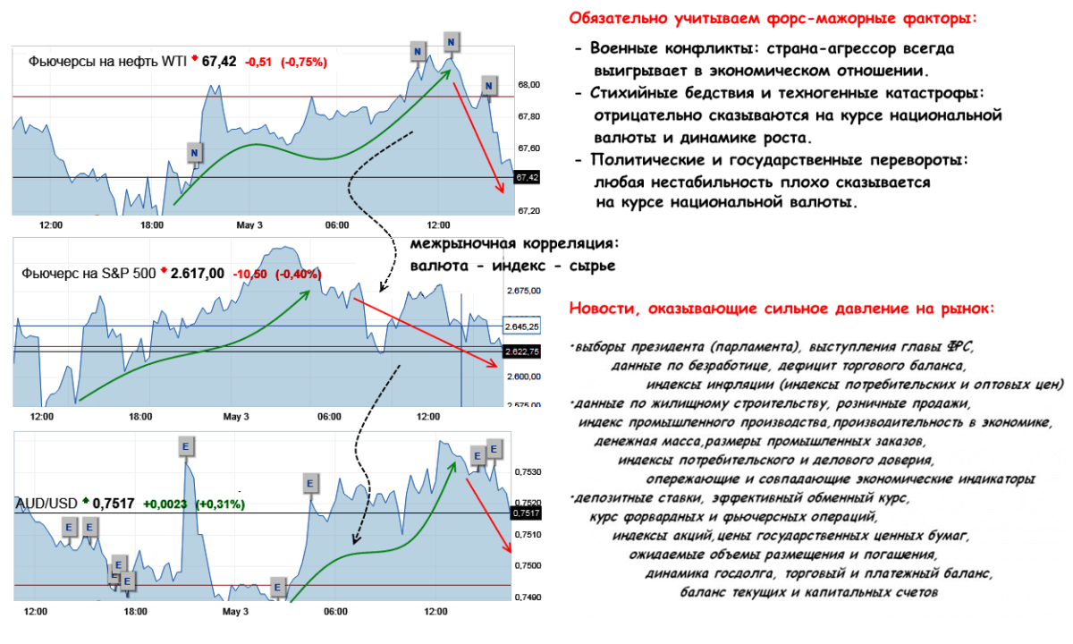 На финансовый рынок влияет абсолютно все, но информацию нужно оценивать комплексно − не каждое событие дает сильную реакцию цены. Те факторы, которые определяются как «ожидания» и легко прогнозируются стандартными методами, рынок давно учел в текущей цене и спекулировать на них поздно. Рекомендуем проанализировать, почему статистика, событие или иная «плановая новость» в итоге оказались недостаточно сильными («+» или «−») и не вызвали разворот тренда или спекулятивную реакцию. Например: