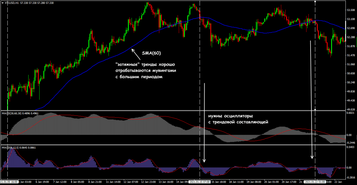 Несмотря на спекулятивные броски, классические системы тренд+осциллятор дают по нефти уверенные точки входа, только осцилляторы нужно выбирать с трендовой, а не импульсной составляющей (например, MACD).