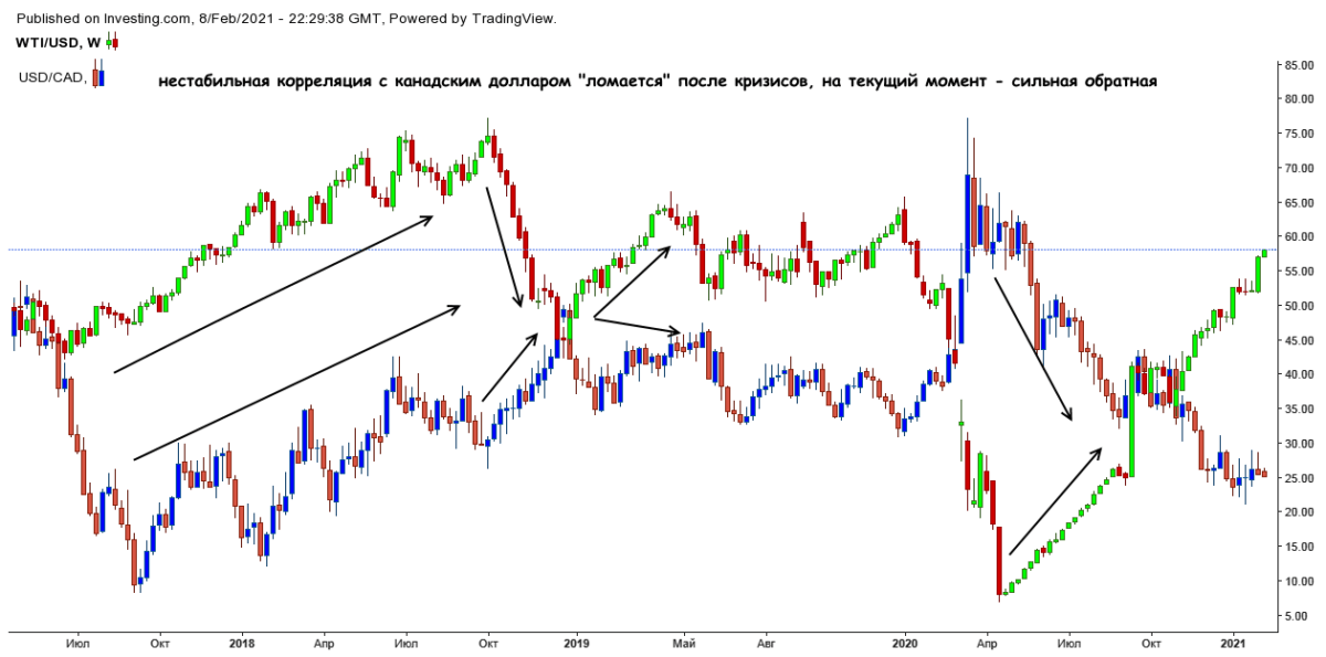 Независимо от того, где торгуют крупные игроки, реакция на фундаментальные события и/или информацию обычно сильная, но краткосрочная, и на спекуляциях всегда происходит обратный импульс. Валютные пары стран с сильной сырьевой зависимостью от энергетических активов − Канада, Япония, Австралия, Новая Зеландия – всегда используют корреляцию с нефтью как опережающий индикатор.