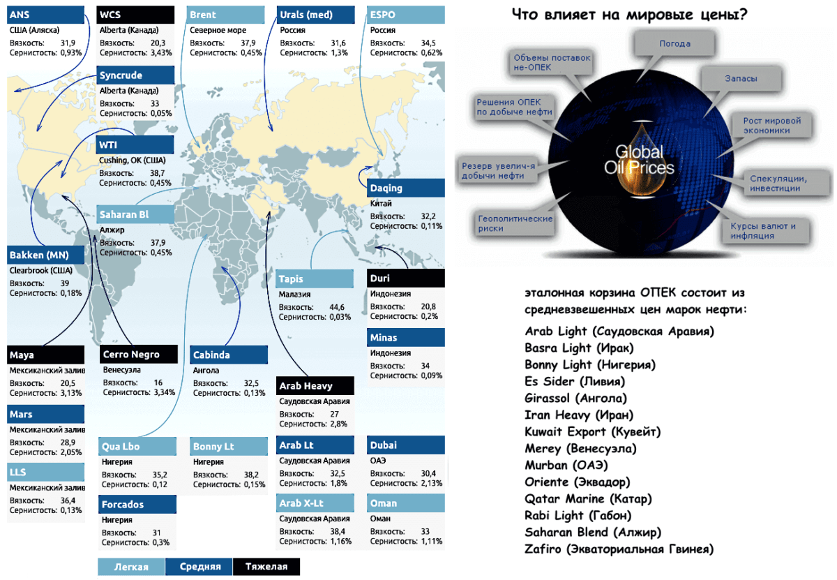 Сырье из разных месторождений имеет разные физико-химические параметры, логично, что и цена на них должна быть разной. Эталонные (benchmark crude) сорта – устойчивые смеси нескольких сортов нефти с жесткими параметрами (% серы, плотность), цена которых считается базовой для биржевых операций.