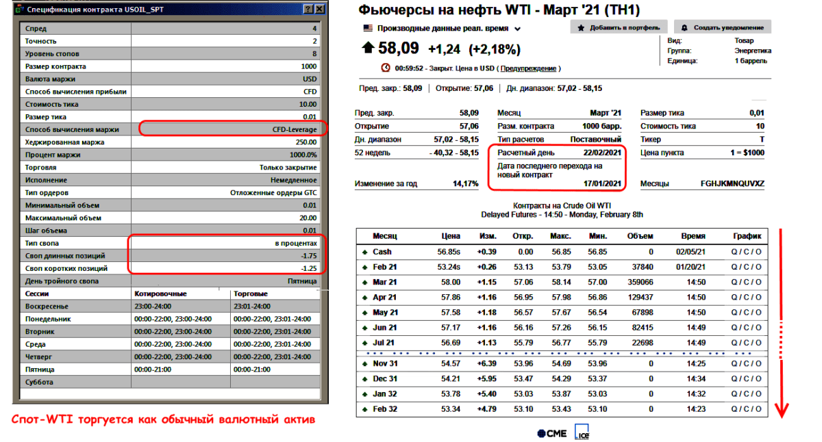 При открытии счета сразу определитесь, можно ли торговать нефтью в форме спот-актива. Если у вас открыта сделка по CFD, то торгуем как Форекс-актив и держим сделку сколь угодно долго. Платим спреды/свопы как обычно. Режим торговли зависит от формы контракта.