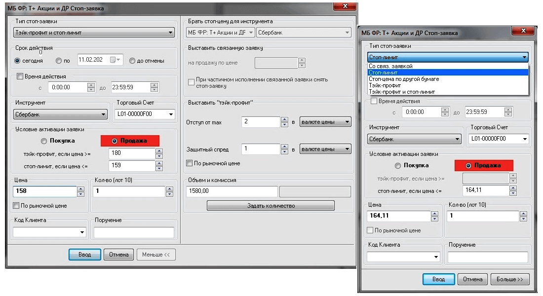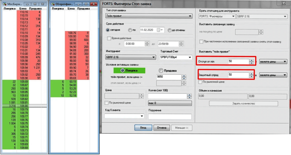 Ордер TP в quik выбирается в поле «Тип Stop-заявки»: левая часть такая же, как и для привычного StopLimit: Take Profit в форме SELL будет открыт, если текущая цена будет ≥ (выше или равна) Stop-цене, а если текущая цена уже ≤ (ниже или равна) – откроется обычный BUY. В правой части окна параметров заполняются опции «Отступ от мах»/«Защитный спред» и условие для единицы измерения − «в валюте цены» или «в процентах».