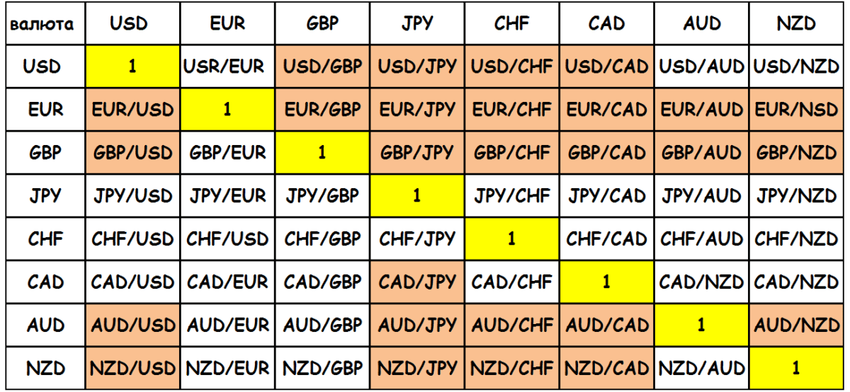 Методически для формирования кросс-пар используют примерно такие таблицы – действующие варианты активов выделены цветом: