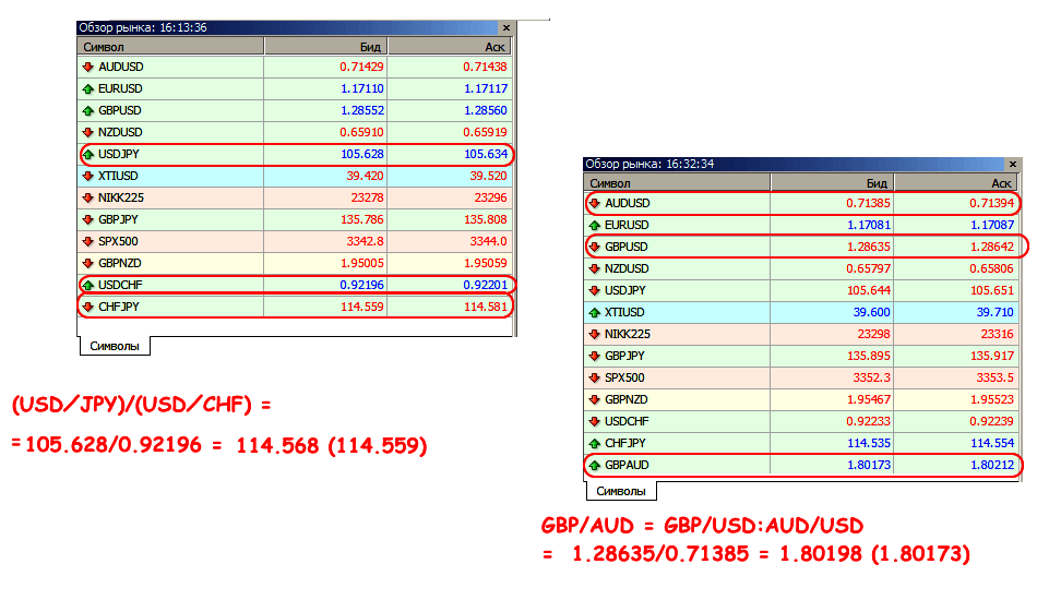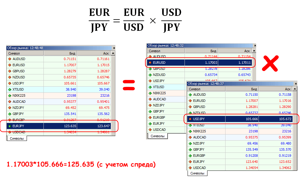 Если одна пара имеет прямую котировку к доллару, а вторая – обратную, то для получения кросс-курса эти значения нужно умножить. Примерно так: