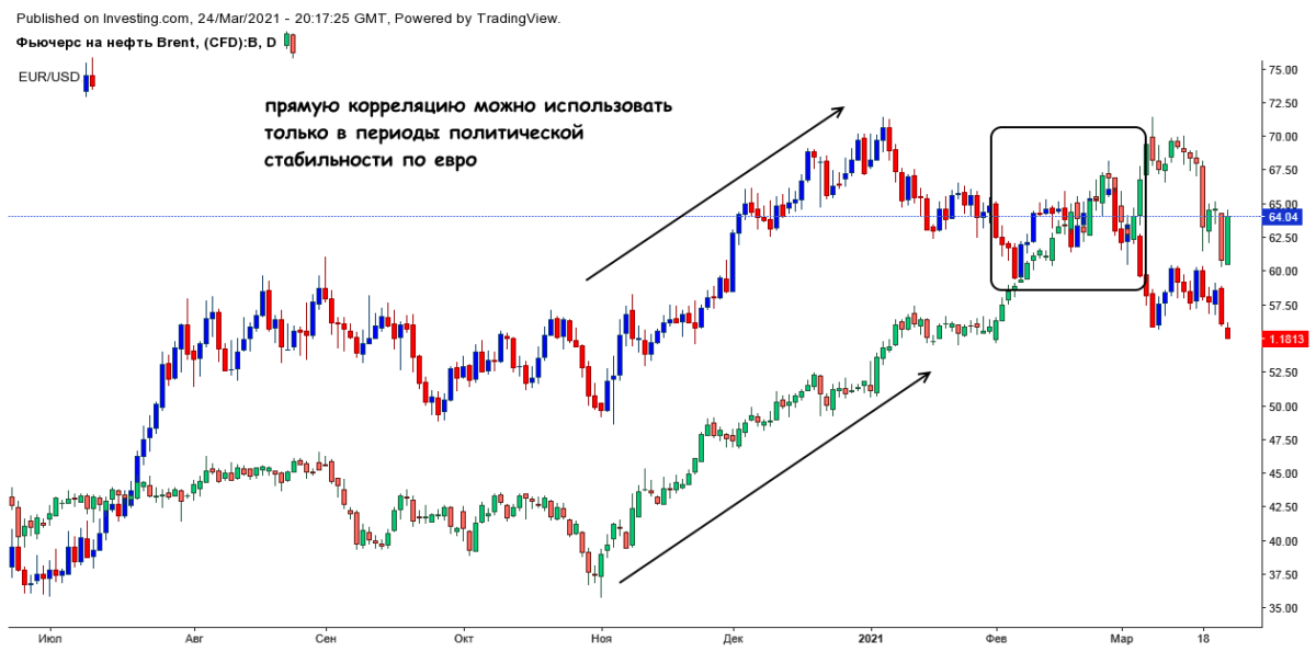 В реале корреляция Brent с валютными активами очень нестабильная. Имеет смысл рассматривать только связь с EUR/USD и GBP/USD, да и то только для среднесрочного анализа, на периодах от H4 и выше.