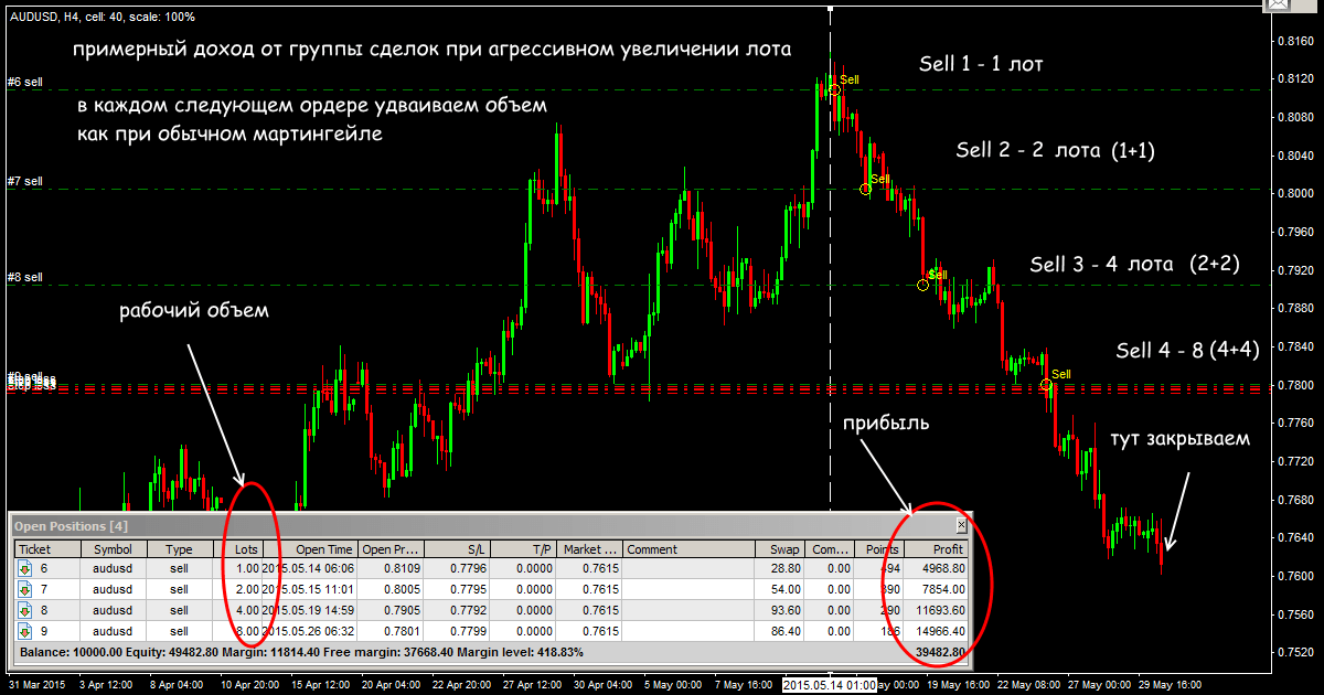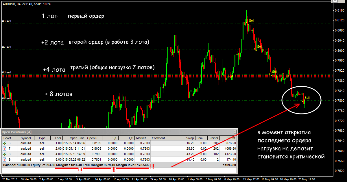 Трейдеры, имеющие достаточный уровень депозита и кредитного плеча, могут работать по более динамичной схеме, удваивая объем следующего ордера: 1-2-4-8 лотов. Так же быстро растет нагрузка на депозит и риск больших потерь при резком развороте, но если есть четкое подтверждение направления и продолжения тренда, то это хороший шанс неплохо заработать.