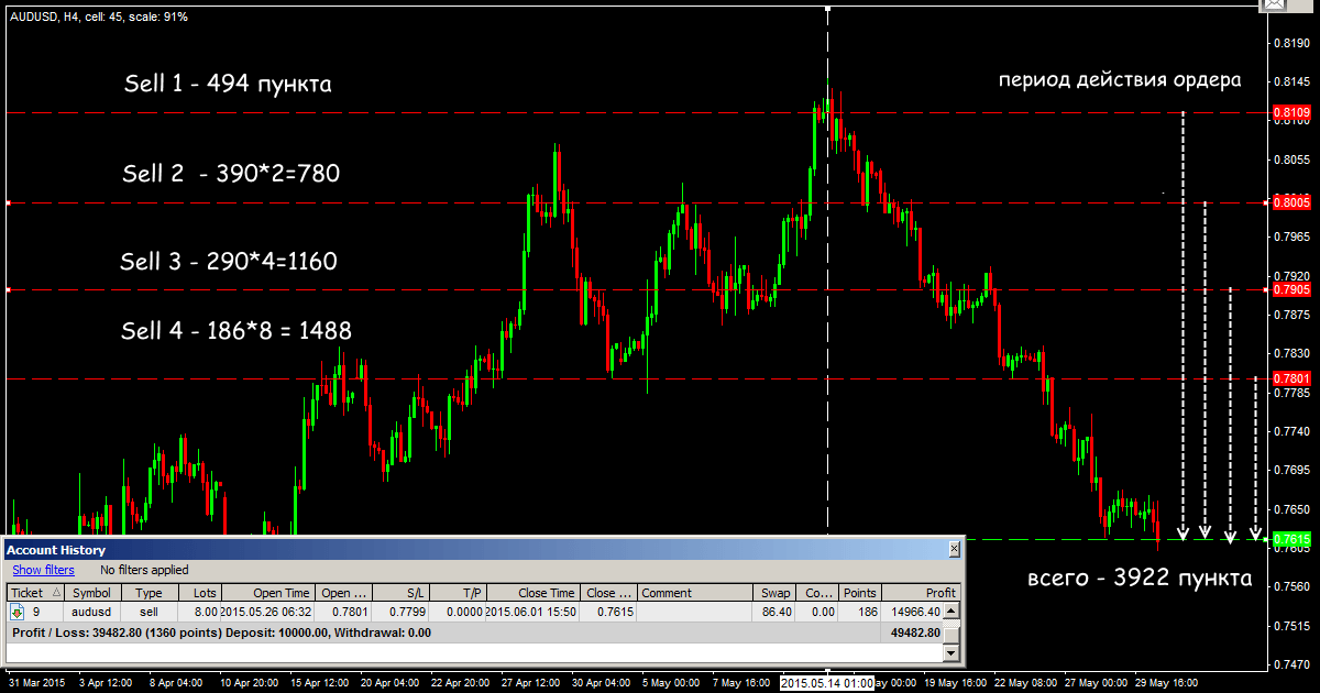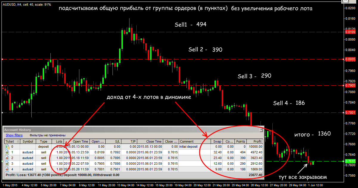 В теории эта методика должна давать среднюю прибыль при минимальном риске. Когда цена начинает давать профит, первый ордер не меняем (1 лот) и открываем дополнительные сделки с таким же объемом.