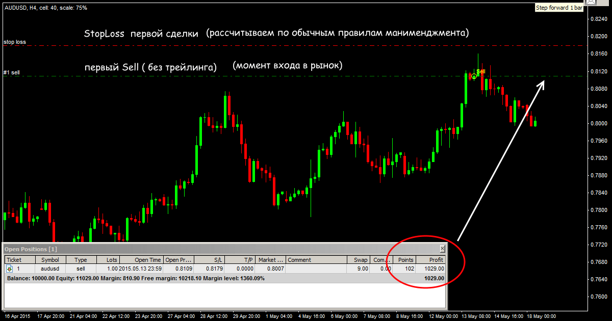 В результате методика пирамидинга показала лучший результат, чем просто сопровождение одной сделки трейлингом. Общий профит составил 1360 пунктов.