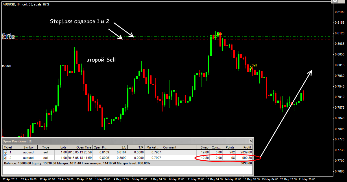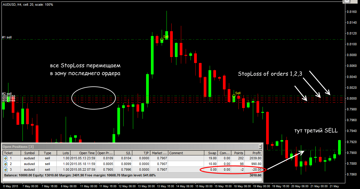 Далее добавляем новые ордера SELL по мере появления дополнительных торговых сигналов, все StopLoss переносим на цену открытия первой сделки.