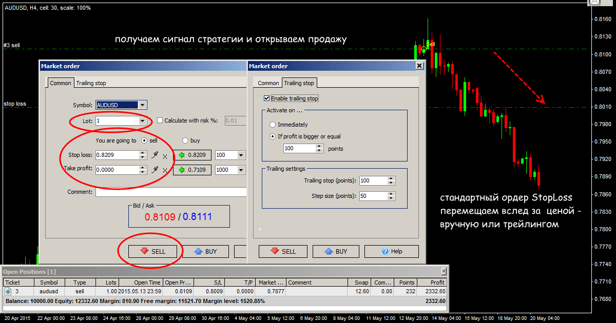 Опять переносим StopLoss на уровень цены открытия второго ордера. Если тренд продолжается, открываем дополнительные позиции: