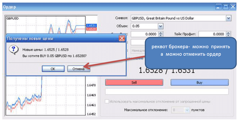 При этом торговая система брокера может предложить новую квоту по сделке взамен неисполненного ордера. В таком случае у трейдера есть два варианта действий – это либо отменить сделку вообще, либо воспользоваться предложенной реквотой брокера.