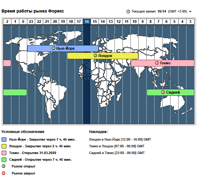 Начало торговых сессий и временную разницу с общемировым временем можно уточнить в любом экономическом календаре на общедоступных ресурсах или на сайте брокера. Рекомендуем онлайн-сервис Forex Market Hours – достаточно указать актуальный часовой пояс и автоматически торговое расписание перестроится по местному времени.
