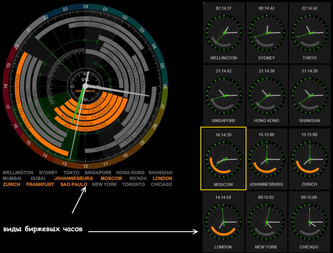 Напомним, что часовые пояса принято отсчитывать от нулевого меридиана, который считается границей между восточным и западным полушариями – это время по Гринвичу, или GMT.В зоне знаменитой обсерватории вблизи Лондона считается GMT 0, далее часовые пояса меняются с шагом в один час. Это время зависит от сезона − в странах, где принято летом переводить местное время на час, а зимой возвращать обратно. Во многих источниках вам встретится всемирное (мировое) или универсальное координированное время UTC, шкала которого привязана к атомным часам. Оно не меняется, то есть с учетом сезонности корректируется смещение местного времени относительно UTC. Именно UTC принято в качестве независимого ориентира и время работы основных бирж в большинстве справочных систем привязано именно к нему.